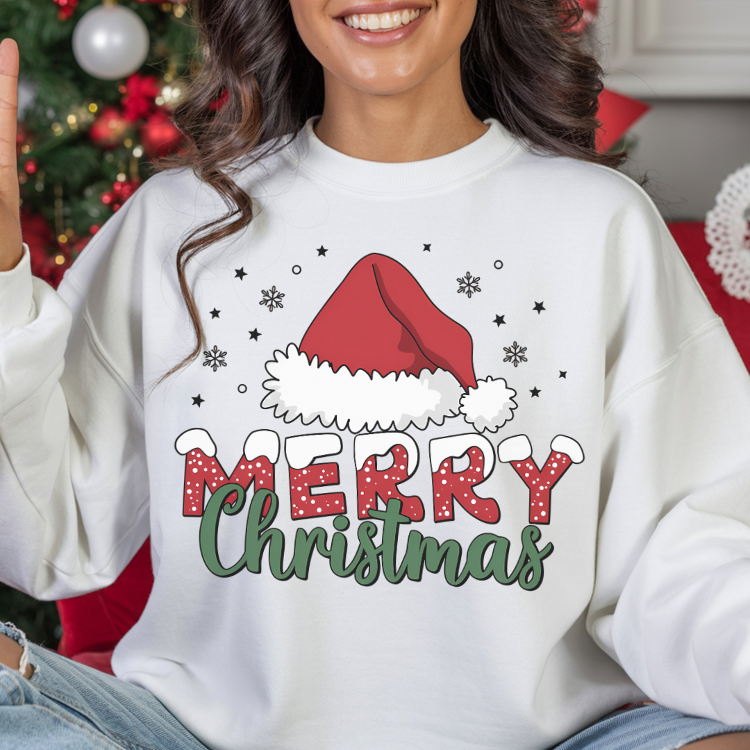 Stay cozy and festive with this Merry Christmas Sweatshirt featuring a Santa Hat design. Perfect for adults looking to add a touch of holiday cheer to their wardrobe. Ideal for Christmas celebrations and gatherings.