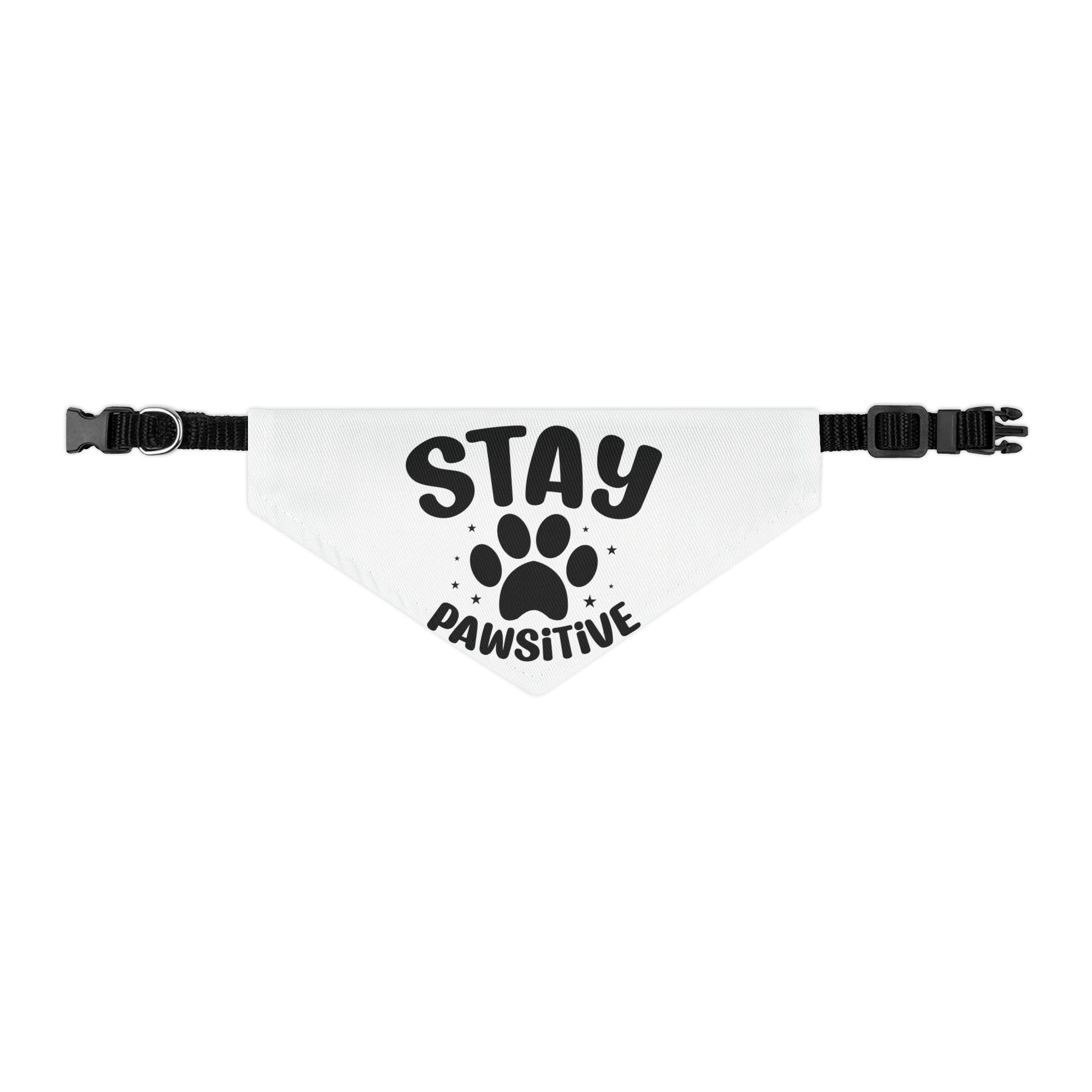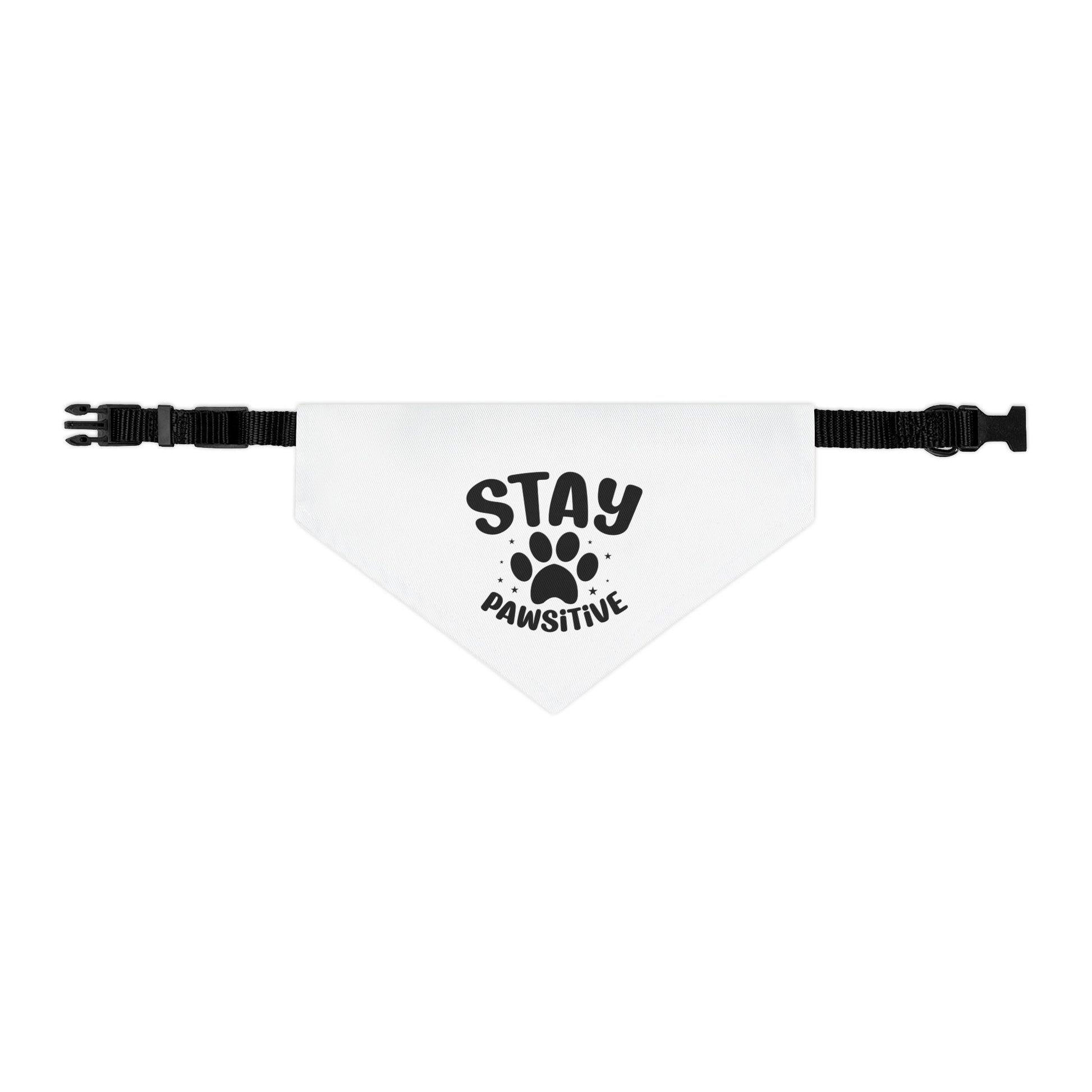 Stay Pawsitive Pet Bandana Collar - White Dog Bandana with Paw Print. This cute and durable pet bandana collar is perfect for keeping your furry friend stylish and comfortable. It is great for pet owners who want to add a fun touch to their pet's look. Perfect for celebrations like birthdays, holidays, or just for everyday wear.